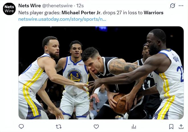 12月26日,NBA记者埃文-斯迪瑞报道,雄鹿、活塞、勇士等多支球队有意交易得到小迈克尔-波特。篮网希望在波特的交易中获得一个未来首轮签作为回报,勇士球迷们都憧憬着波特加盟的场景,毕竟本赛季波特是场均25.8分7.4篮板+三分命中率40.4%的出色锋线。