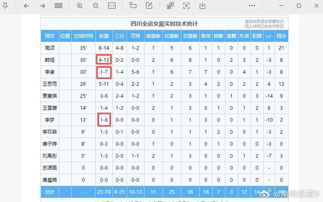 这里重点说说四川女篮,他们在决赛的数据惨不忍睹,四项命中率、篮板、助攻、失误等七项数据都输给了广东女篮,他们唯一在抢断上赢了广东队。四川女篮几个核心球员表现特别糟糕,李梦全场6中1,李缘7中1,韩旭13中4,三大核心球员26中6,狂砸20铁,韩旭半场怒砍0分,更是令人目瞪口呆,这样的表现怎能夺冠?