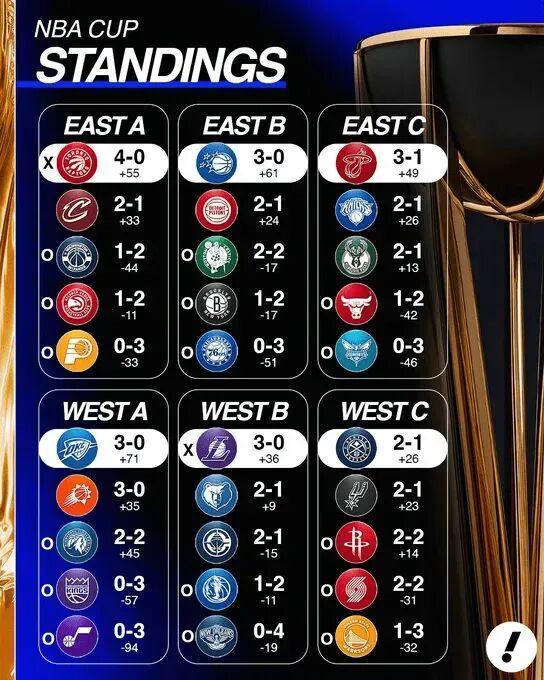 先给你们看看NBA杯的小组最新战绩排名情况