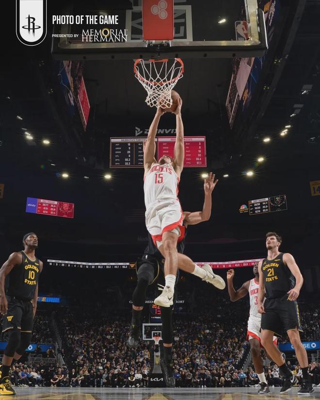 第三节最后时刻,又是他连得4分,最后那记突到篮下双手暴扣扳平比分的一球,彻底将火箭的气势打了出来。