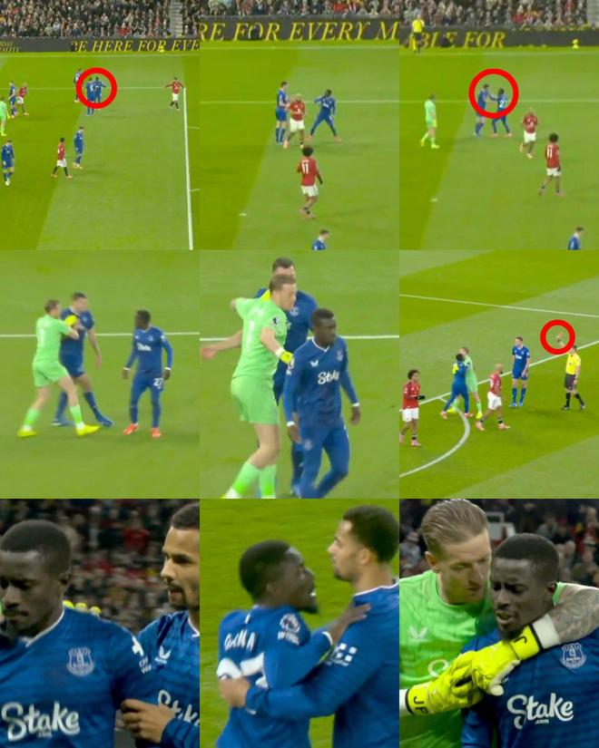 盖耶怒火遮眼打了队友一巴掌,随后基恩一掌推开。主裁托尼·哈林顿正好在附近目睹这一幕,他亮出红牌罚下36岁老将盖耶,VAR视频助理裁判保罗·霍华德也确认了这一判罚。基恩此时指着前额,讽刺队友不用脑,盖耶更为愤怒,被门将皮克福德牢牢抱住,才没有做出进一步的过激行为。